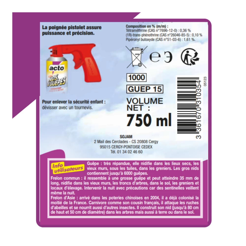 Fabriqué en france, l’aérosol acto spécial nids de guepes est un outil indispensable dans la lutte contre les nids de guêpes et de frelons, y compris ceux difficiles d’accès. Ce produit a été conçu pour être très efficace, d’où son utilisation par les pompiers. Il fonctionne grâce à un système de propulsion au gaz comprimé qui assure une portée exceptionnelle jusqu’à 8 mètres. L’aérosol est idéal pour éliminer les essaims à distance, minimisant ainsi le risque de piqûres. Son action foudroyante paralyse immédiatement les insectes, provoquant leur mort.caractéristiquesfabriqué en france : garantie de qualité et de performanceutilisé par les pompiers : gage d’efficacité éprouvéeaction foudroyante : paralyse immédiatement l’insecte, provoquant sa mortportée longue distance : propulse le liquide insecticide jusqu’à 8 mètresutilisation sécurisée : permet de détruire à distance les essaims, réduisant le risque de piqûrepoignée pistolet : assure puissance et précisionconception brevetée : formule unique renforcée par l’action synergisée du pipéronyl butoxydecompositionl’aérosol acto spécial nids de guepes est composé de :tétraméthrine (cas n°7696-12-0) : 0,36 %(1r)-trans-phénothrine (cas n°26046-85-5) : 0,10 %pipéronyl butoxyde (cas n°51-03-6) : 1,61 %mode d’emploipour une utilisation optimale, il est conseillé de traiter le nid à la tombée de la nuit lorsque tous les insectes sont rentrés au nid. Agitez l’aérosol avant utilisation, retirez la sécurité enfant, vérifiez l’orientation du diffuseur, et appuyez sur la gâchette tout en tenant d’une main la poignée et de l’autre l’aérosol. Assurez-vous de vous tenir à une distance sécurisée, jusqu’à 8 mètres du nid, lorsque vous pulvérisez.précautions d’emploiil est important de lire attentivement les instructions avant utilisation. Ce produit est extrêmement inflammable et sous pression. Évitez toute exposition à la chaleur, aux flammes nues ou à toute autre source d’inflammation. Utilisez uniquement en plein air ou dans un endroit bien ventilé. En cas de contact avec les yeux, rincez avec précaution à l’eau pendant plusieurs minutes. Éliminez l’emballage conformément aux directives locales.vendu en lot de 2 aérosols utilisez les biocides avec précaution. Avant toute utilisation, lisez l’étiquette et les informations concernant le produit. Produit dangereux : respectez les précautions d’emploi.