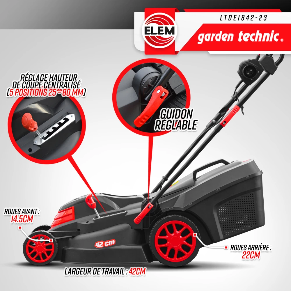 Cette tondeuse électrique 1800w elem garden technic est très légère et maniable ce qui lui permet d’être utilisable sur différents types de terrain. Grâce à sa largeur de coupe de 42 cm, elle réduira considérablement votre trajet de tonte. Elle convient parfaitement aux personnes ayant un jardin de surface moyenne. Grâce à son système de réglable de la hauteur de coupe 5 positions (ajustable entre 25 et 80 mm), cette tondeuse s’adapte à vos besoins.